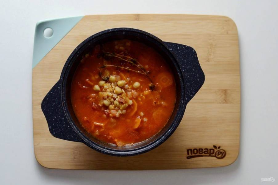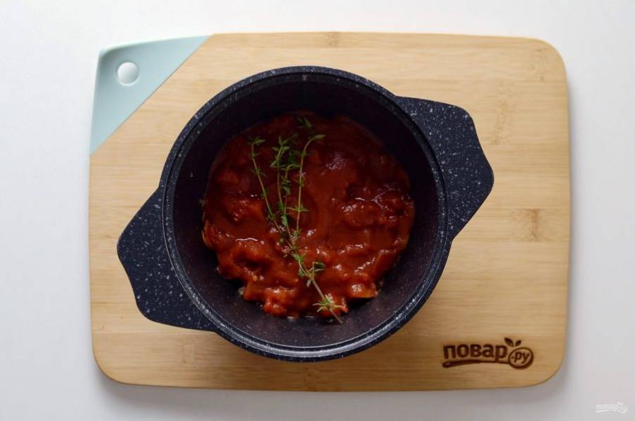Влейте измельченные томаты, добавьте тимьян и томите еще 2 минуты.