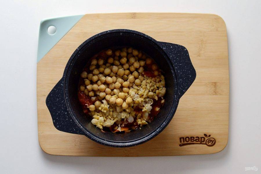 Половину нута разомните вилкой. Добавьте весь нут в кастрюлю, влейте воду и бульон. Доведите до кипения, убавьте температуру и томите 5-6 минут.