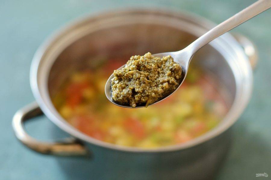 В самом конце добавьте песто и проварите суп еще 1 минут.