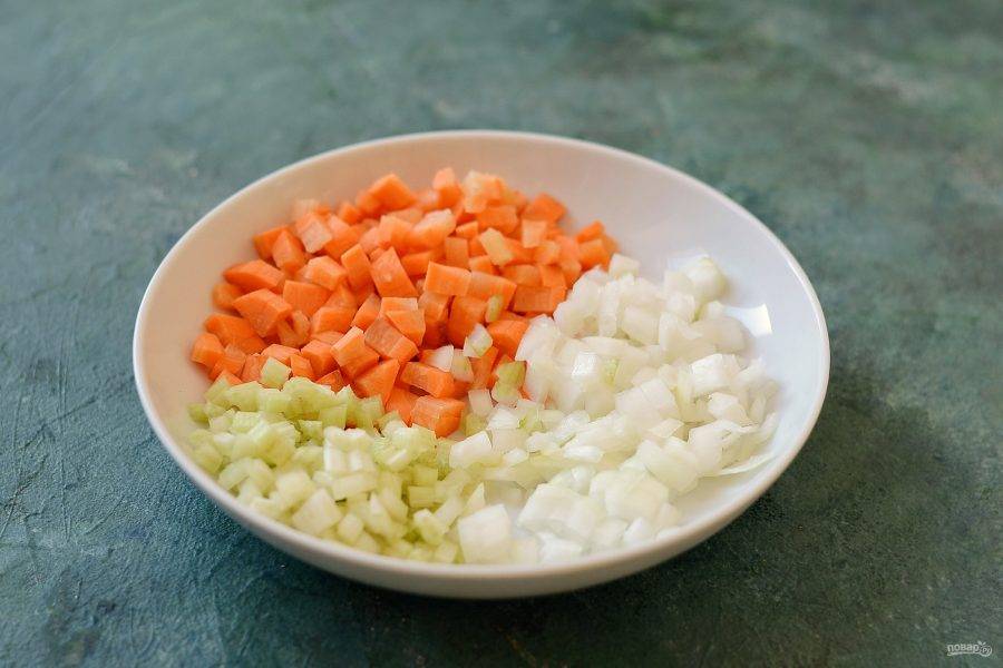 Нарежьте лук, морковь и сельдерей на мелкие кубики.