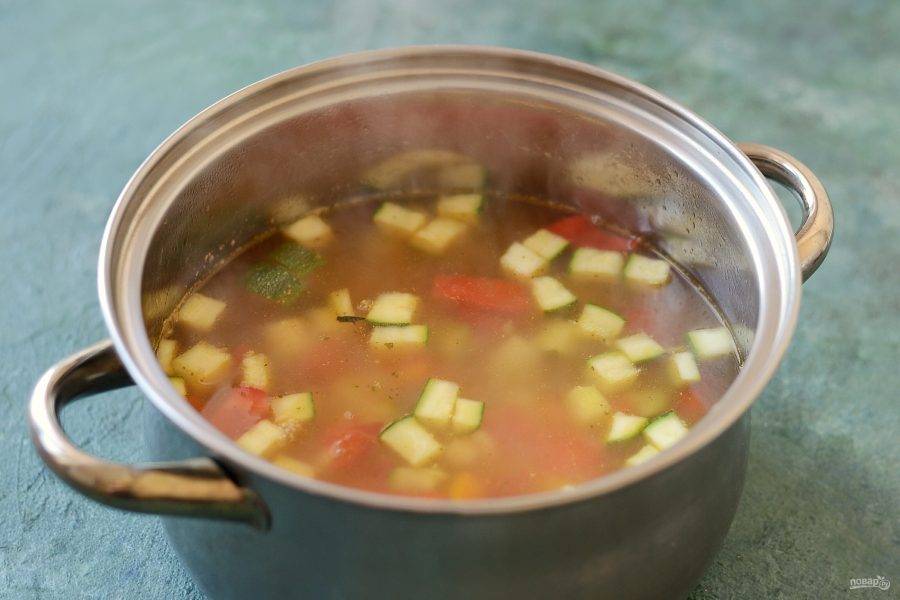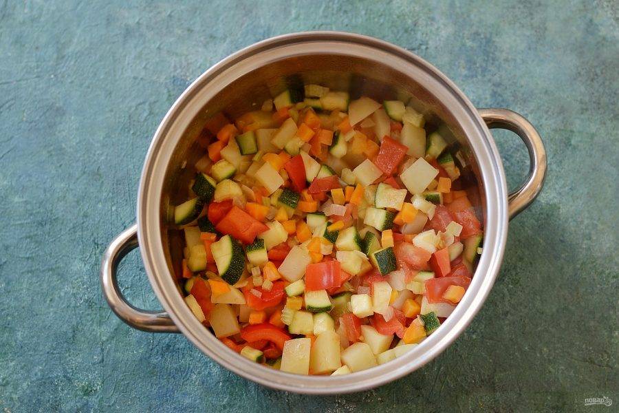 Убавьте температуру на минимум, добавьте картофель, сладкий перец, помидоры и цукини. Готовьте еще 10-15 минут, периодически помешивая.