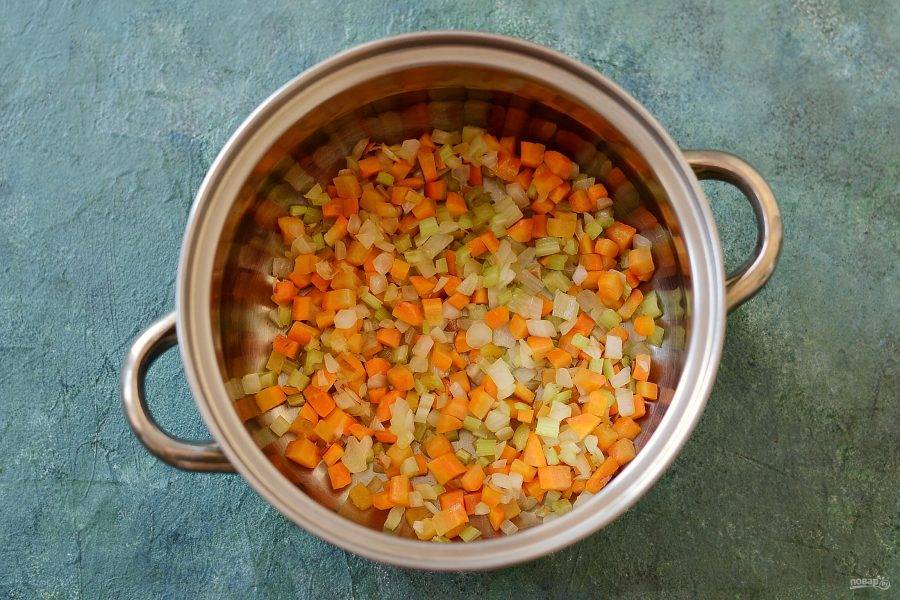 Разогрейте кастрюлю с толстым дном. Обжарьте в масле лук, морковь и сельдерей примерно 5-6 минут. Постоянно помешивайте.