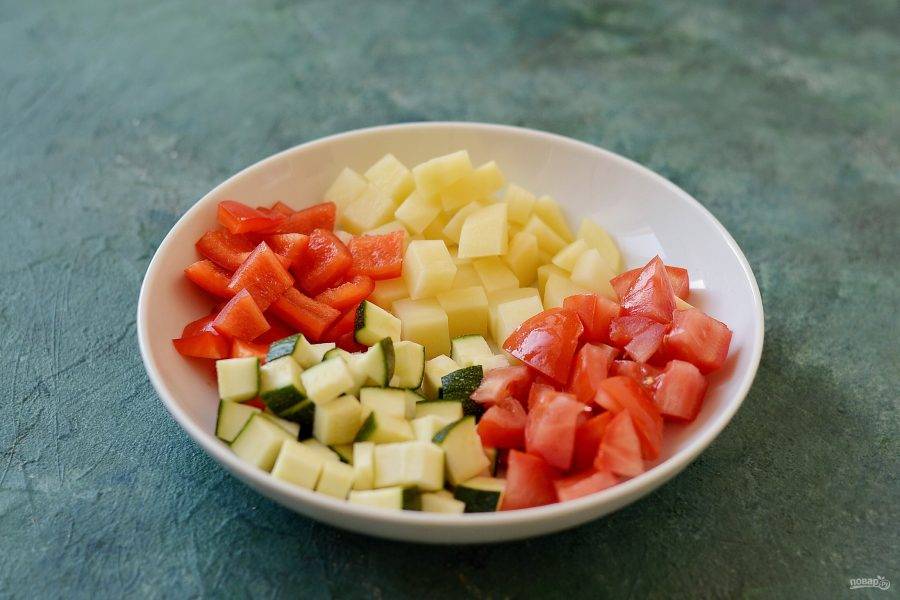 Болгарский перец, картофель, цукини и помидоры нарежьте крупными ломтиками.