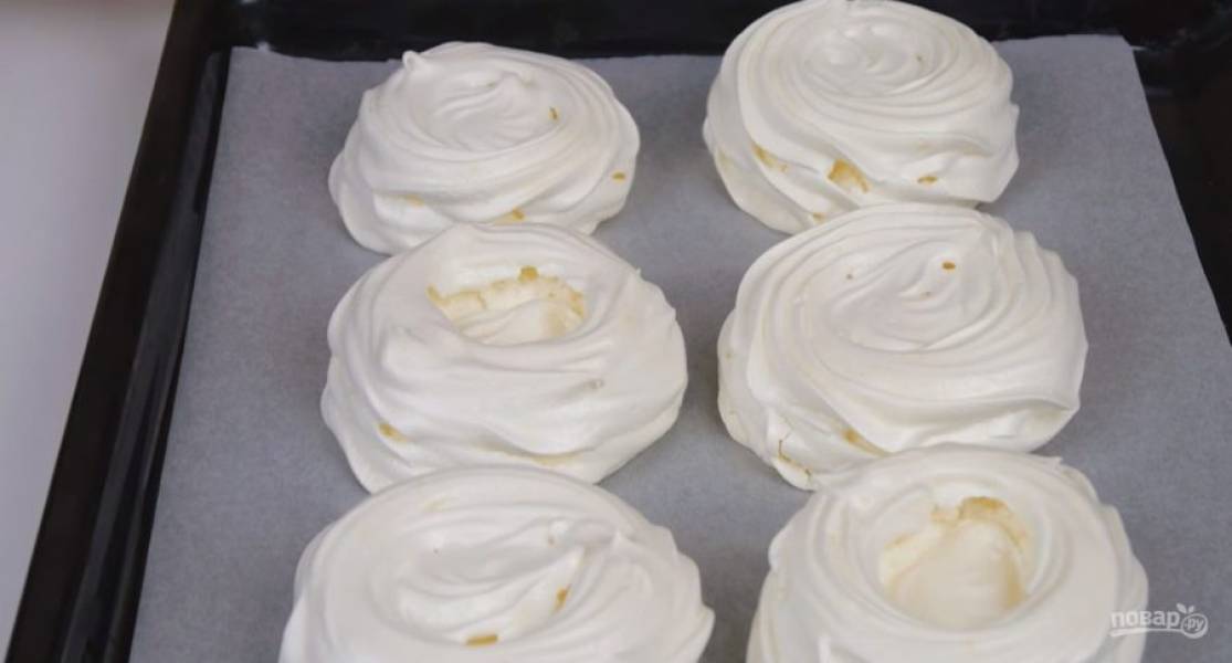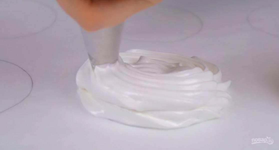 3. Тщательно смешайте на малой скорости миксера. Перенесите массу в кондитерский мешок и высадите на бумагу для выпечки заготовки, формируя небольшой бортик. Отправьте в разогретую до 110 градусов духовку на 1 час.