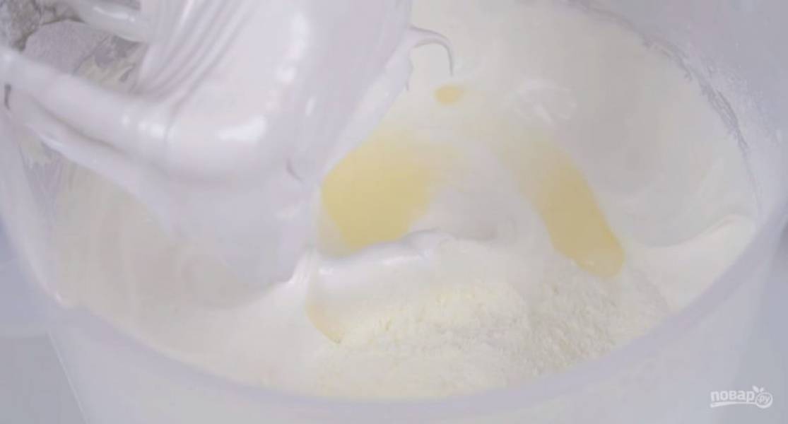 2. Не прерывая взбивания, небольшими порциями добавьте сахарную пудру, смешанную со щепоткой ванилина. Взбейте белки в устойчивую глянцевую массу в течение пяти минут. Добавьте крахмал и лимонный сок.