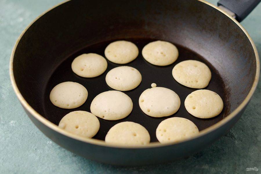 Разогрейте сковороду на среднем огне. Отсадите на слегка смазанную маслом сковороду оладушки небольшого диаметра. Выпекайте их 3-4 минуты.