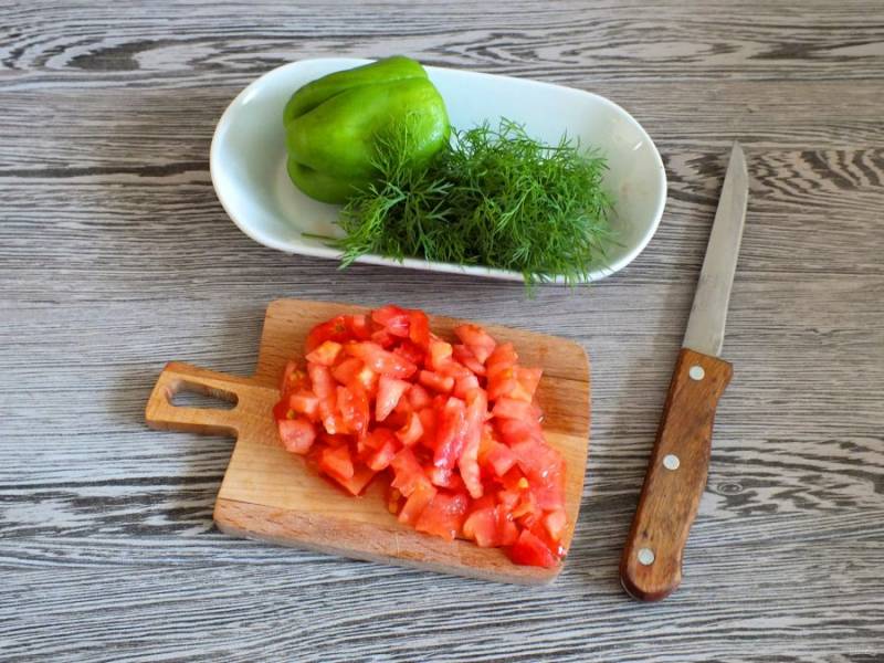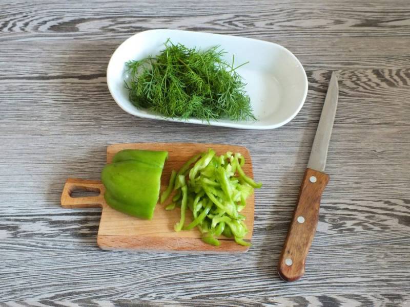 Болгарский перец нарежьте соломкой. Укроп нарежьте помельче.