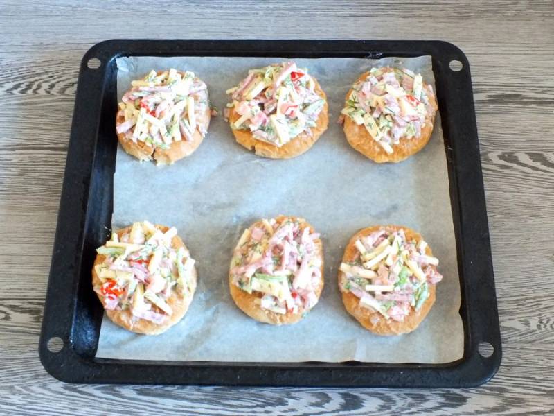 Разложите горкой начинку. Поставьте противень в разогретую духовку на 15 минут или пока не начнет плавиться сыр и появляться румяная корочка.