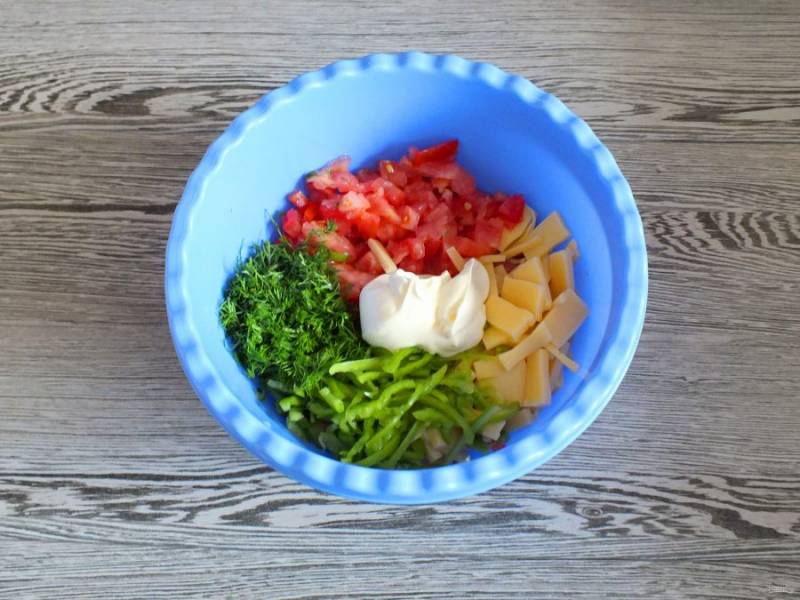 Все нарезанные ингредиенты переложите в чашу и добавьте майонез. Перемешайте.