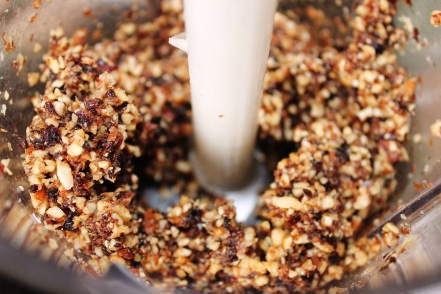 В чашу блендера кладу грецкие орехи и чернослив (его прежде мою и ошпариваю кипятком). Измельчаю.
