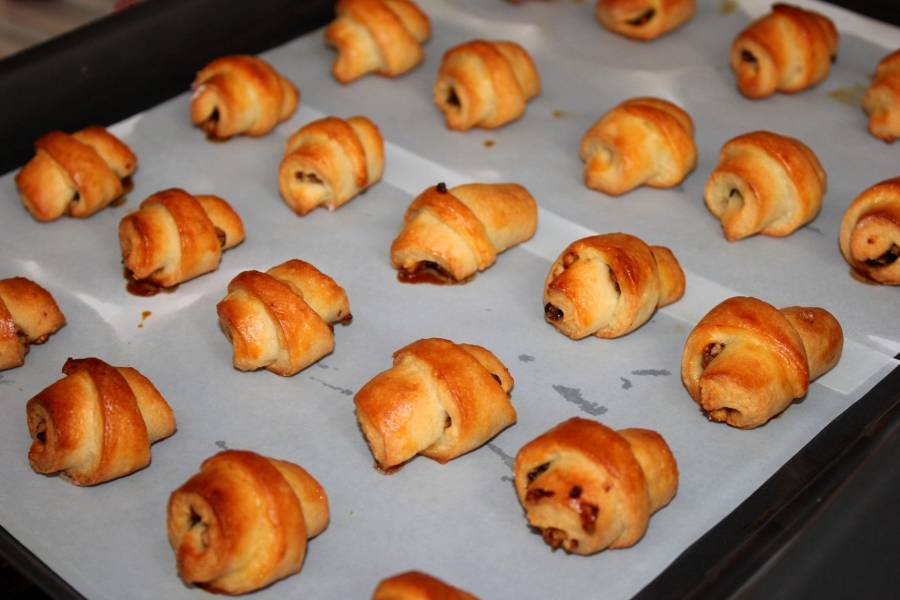 У меня все рогалики поместились на 2 противня. Верх рогаликов смазываю взбитым яйцом. Ставлю противни в разогретую до 180 градусов духовку, на средний уровень, на 30-40 минут. До золотистого цвета.