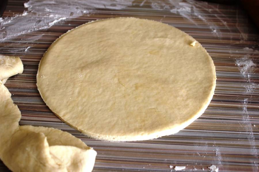 Охлажденное тесто раскатываю в пласт. С помощью плоской тарелки вырезаю из пласта круг, диаметром 26-30 см.