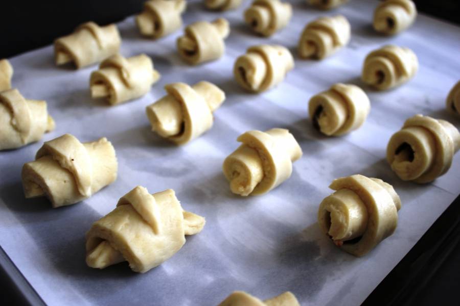 Закручиваю рогалики, начиная от широкой части и переходя к узкой. Укладываю рогалики на противень, застеленный бумагой для выпечки (пропитанной маслом). Аналогично поступаю со второй частью теста. А из обрезков первого круга и второго у меня получился еще третий круг. Начинки хватит на все 3 партии.