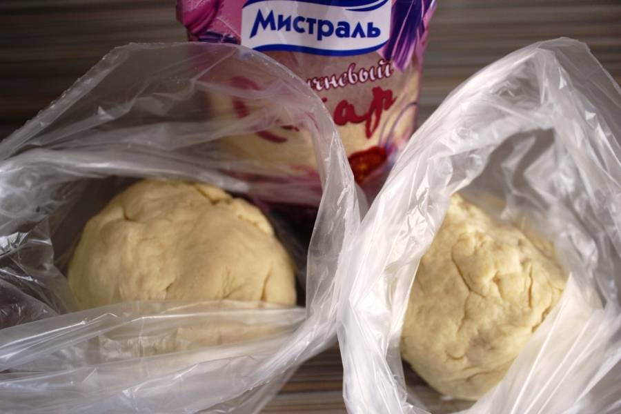 Делю тесто на 2 части, кладу их в пакеты (или заворачиваю пищевой пленкой) и убираю в холодильник на 30 минут. Кстати, часть теста можно заморозить и использовать в следующий раз.