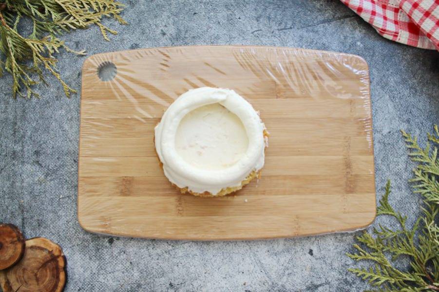 Первый пропитанный корж смажьте творожным кремом и при помощи корнетика сделайте бортики.