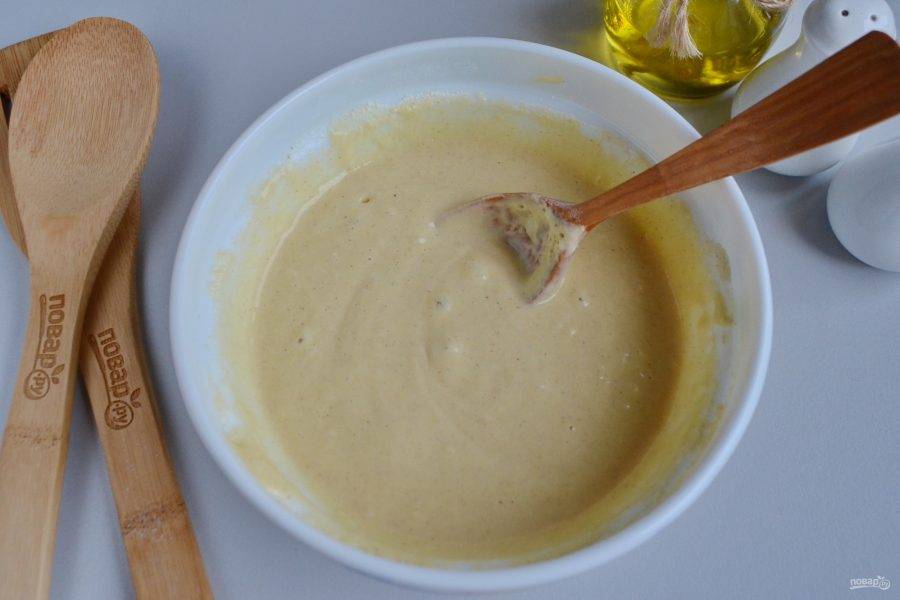 Вбейте яйцо, влейте молоко, венчиком соедините все ингредиенты до получения гладкой однородной массы без комочков.