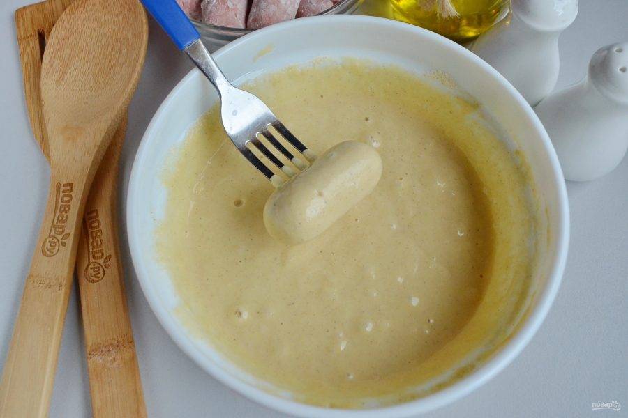 В кастрюле разогрейте рафинированное масло. Каждую сосиску окуните полностью в густой кляр и отправьте в кипящее масло. Это можно сделать щипцами или с помощью двух вилочек, как удобно.