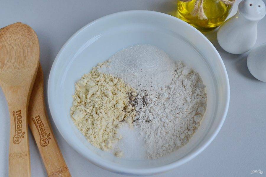 В глубокой посудине соедините кукурузную муку с пшеничной, сахаром, солью, разрыхлителем и перцем. Перемешайте.