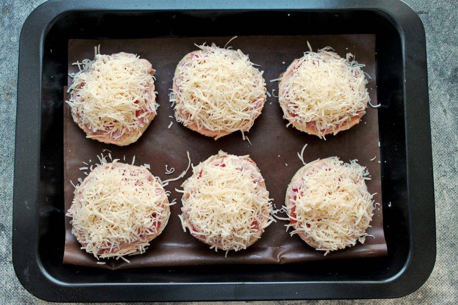 Сыр натрите на средней терке и посыпьте сверху все будущие мини пиццы.