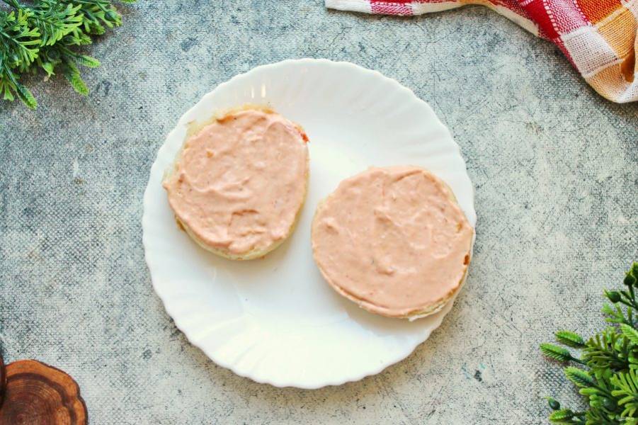 Каждую половинку смажьте соусом с одной стороны.