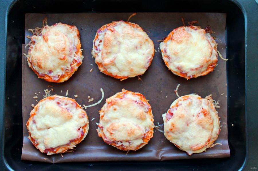 Готовые мини пиццы достаньте и сразу подавайте на стол, пока сыр тянется.