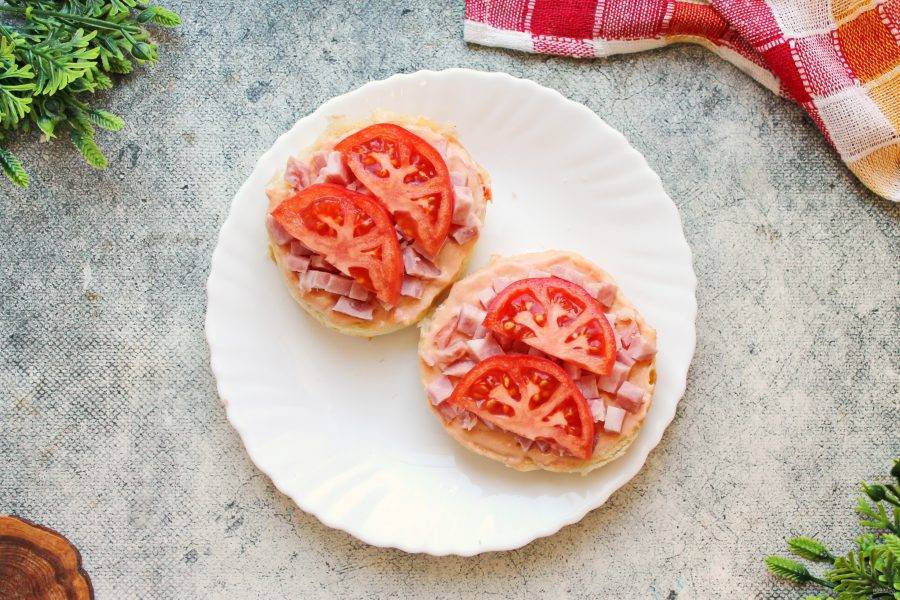 Помидор порежьте на колечки или полукольца и выложите на колбасу.