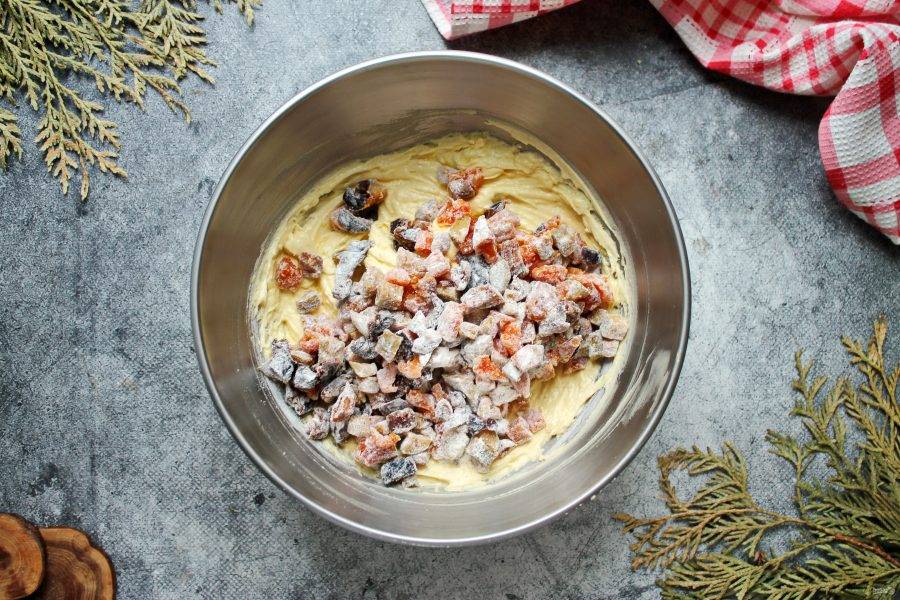 Замоченные сухофрукты порежьте на мелкие кусочки и смешайте с мукой. Добавьте сухофрукты в тесто и перемешайте.