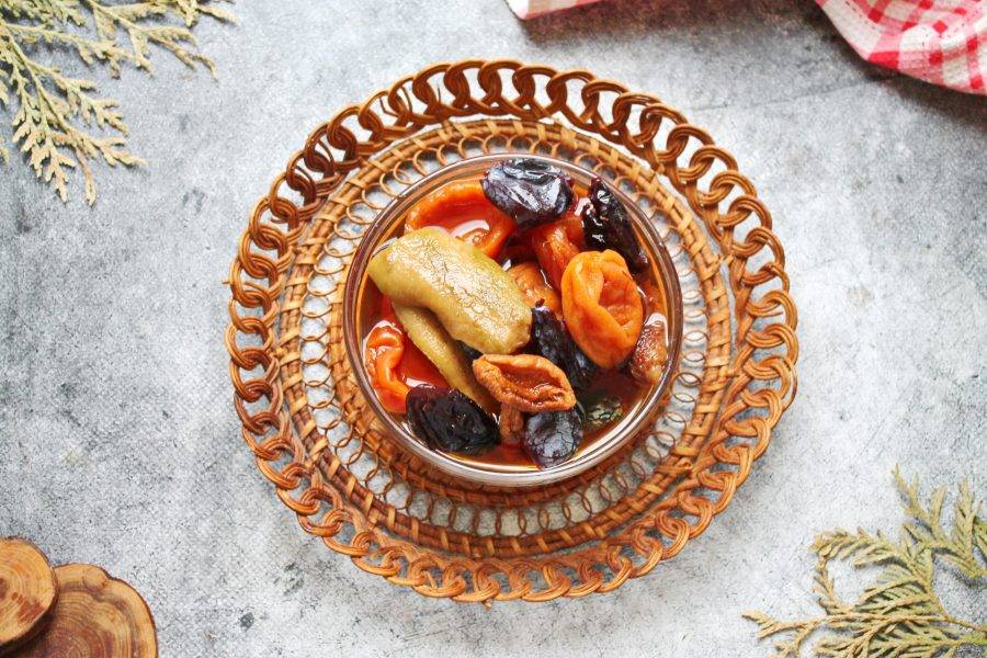 Сухофрукты, у меня курага, чернослив и плод гуава, сполосните, обсушите и выложите в чистую, сухую банку. Залейте сухофрукты коньяком, они должны быть полностью покрыты, плотно закройте и оставьте на 12-24 часа. Сухофрукты откиньте на сито и дайте коньяку полностью стечь.