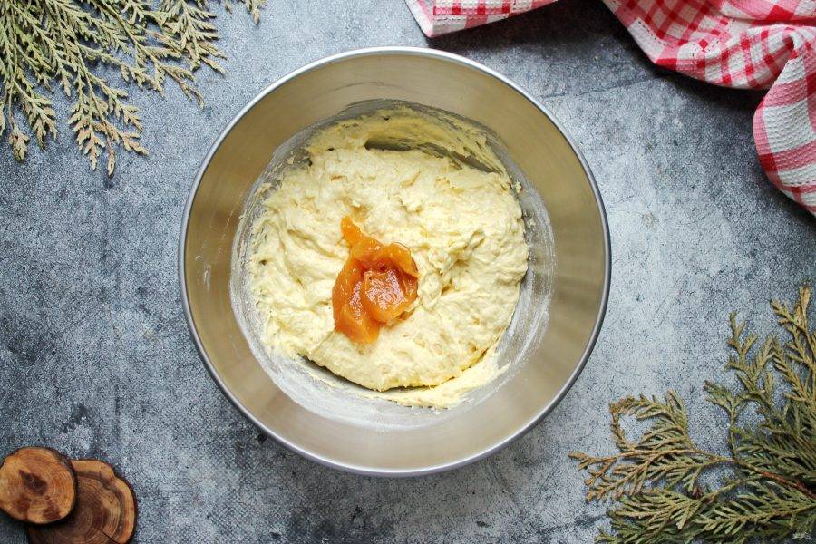 Добавьте в тесто половину абрикосового джема, перемешайте до однородности.