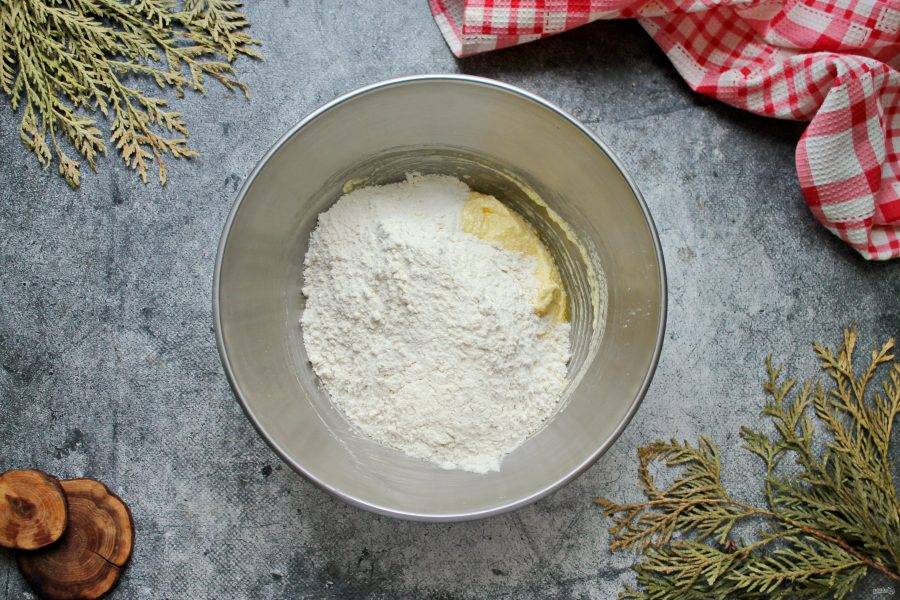 Муку смешайте с разрыхлителем и просейте в масляную массу и перемешайте до однородного теста.