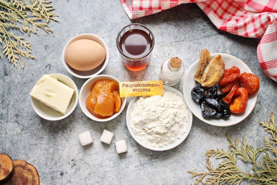 - Мука 125 грамм 100 грамм — тесто, 25 грамм — в сухофрукты