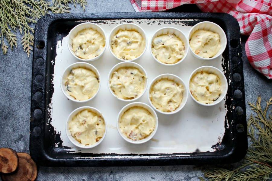 Разложите тесто в бумажные формочки на 2/3 высоты, разровняйте. Я брала усиленные бумажные формочки, им не требуется поддержка, простые нужно ставить в форму с ячейками для маффинов.