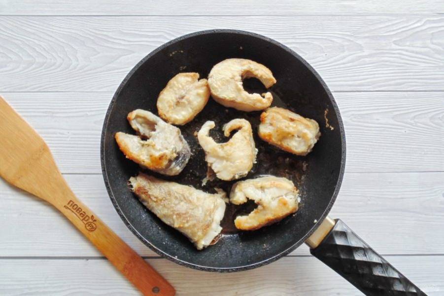 В хорошо нагретую сковороду с подсолнечным маслом выложите кусочки минтая.