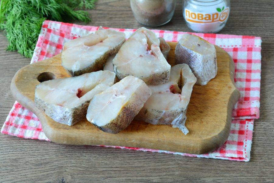 Разморозьте рыбу, почистите, сполосните и нарежьте средними кусочками.