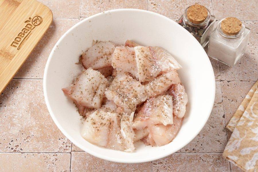 Рыбу промойте, срежьте плавники, хвост и удалите черную плёнку внутри брюшка. Разделайте на филе. Добавьте соль и молотый перец, перемешайте и оставьте на 20 минут.