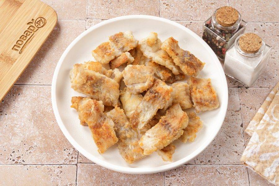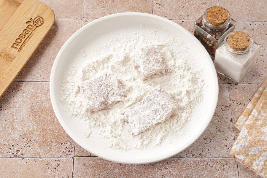 Затем обваляйте каждый кусочек в муке и обжарьте с двух сторон на сковороде до золотистого цвета.