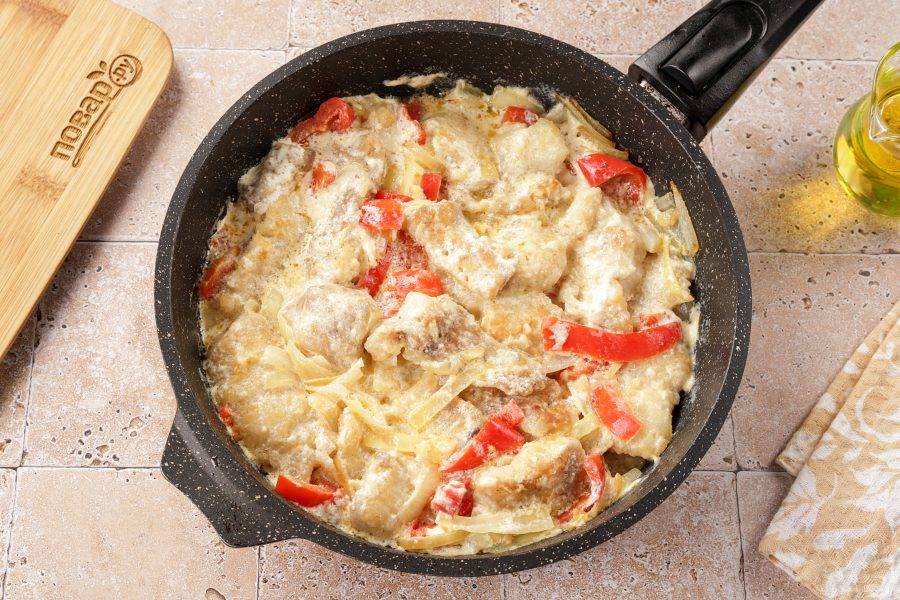Добавьте филе минтая, перемешайте и влейте сливки.
