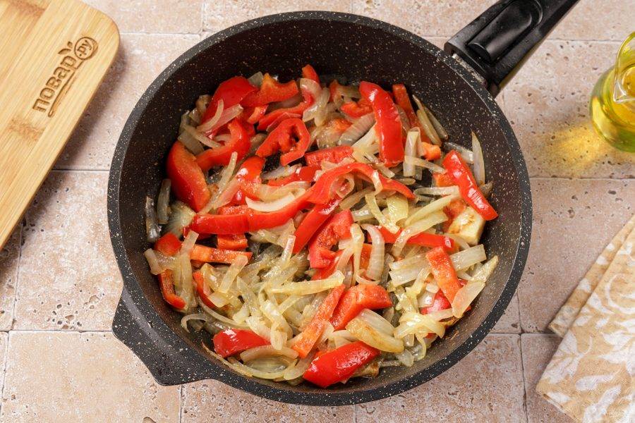 На другой сковороде обжарьте нарезанный полукольцами лук и болгарский перец. Сильно овощи не зажаривайте, они должны стать мягкие.
