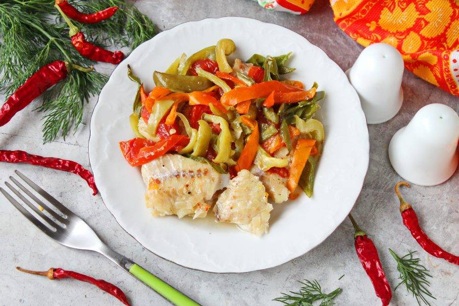Поставьте форму с минтаем с перцем в горячую духовку и запекайте при температуре 180 градусов в течение 20-30 минут. Готовое блюдо достаньте и сразу подавайте к столу.