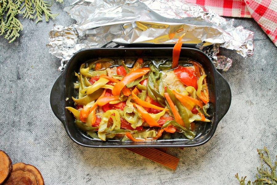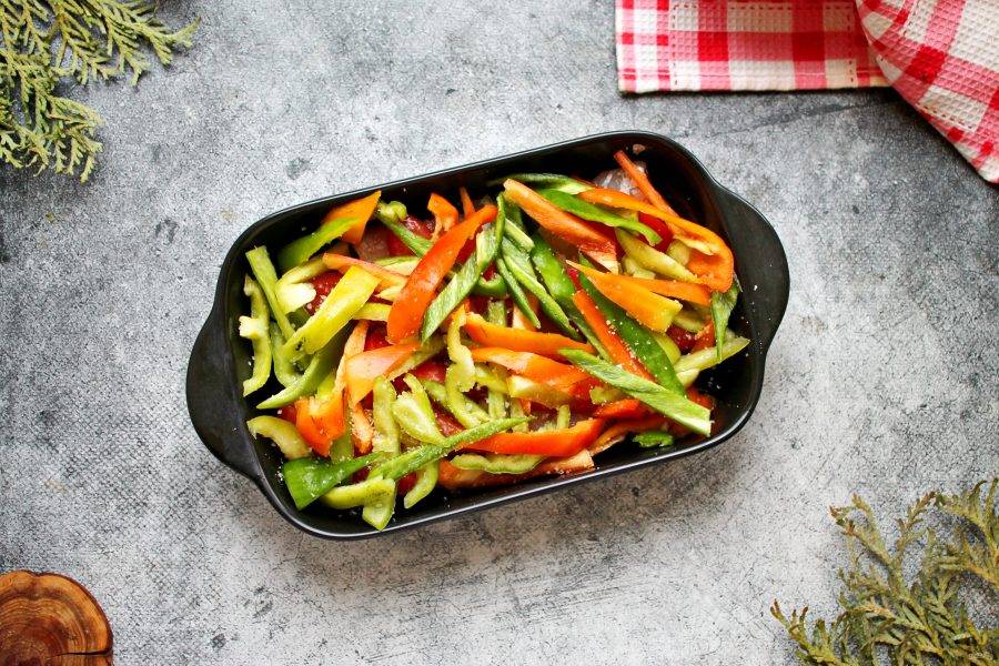 Болгарский перец порежьте крупной соломкой, разложите сверху. Все немного посолите и закройте фольгой.