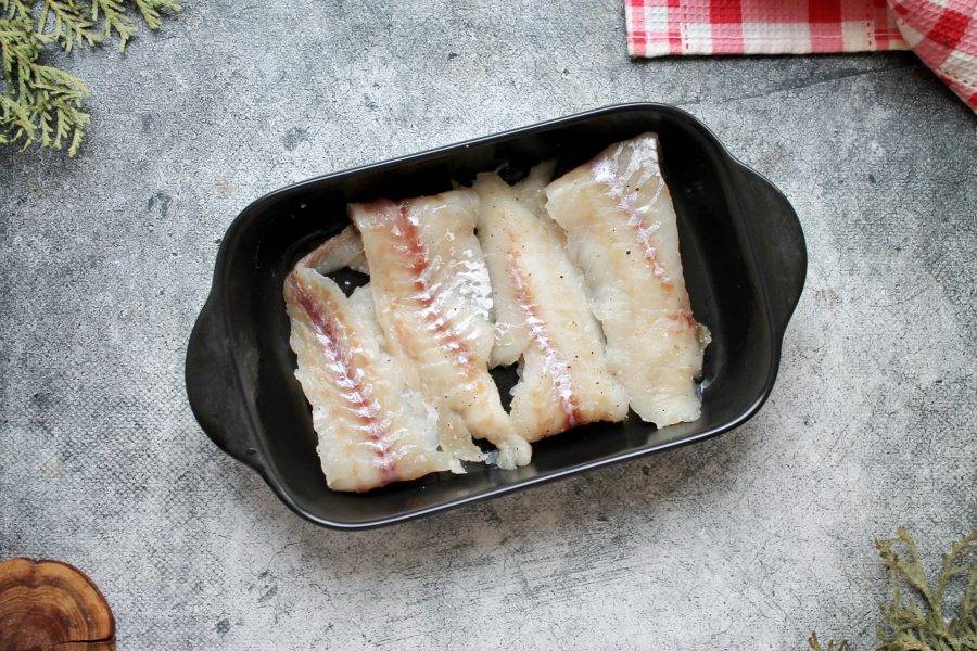 Филе минтая сполосните, обсушите бумажным полотенцем, посолите и поперчите. Форму для запекания смажьте растительным маслом и выложите филе минтая в один слой.