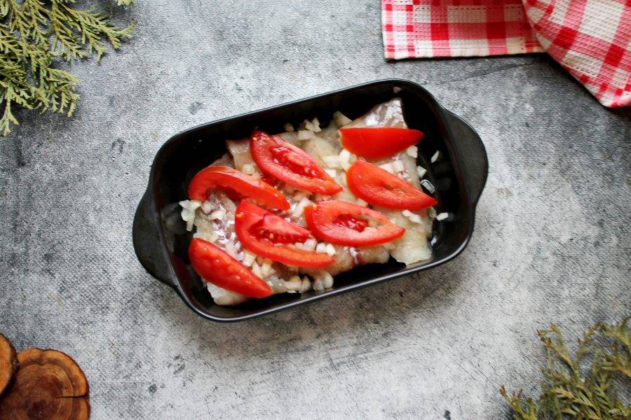 Репчатый лук мелко порежьте и посыпьте рыбу. Помидор порежьте на дольки и выложите на минтай с луком.