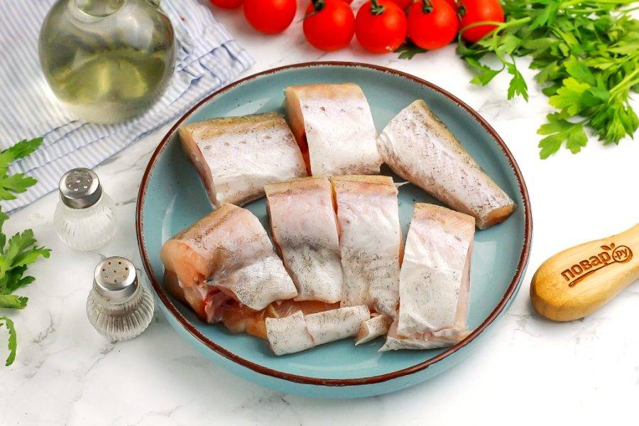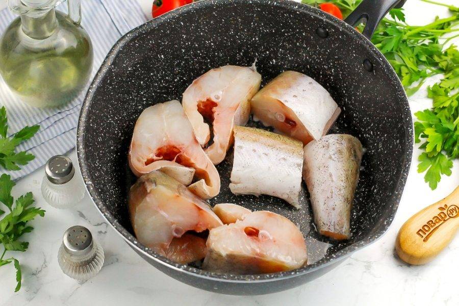 Нарежьте рыбу порционными кусочками, обязательно срезав ножницами все плавники и хвост, они будут только занимать место в сковороде.