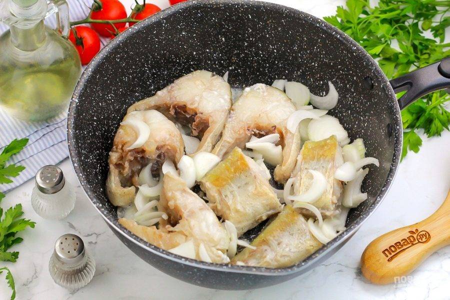 Нарежьте репчатый лук мелкими кубиками или лепестками и добавьте в емкость к рыбе. Обязательно перемешайте, чтобы он оказался на дне и обжарьте еще 3-4 минуты, пока он не станет мягким.