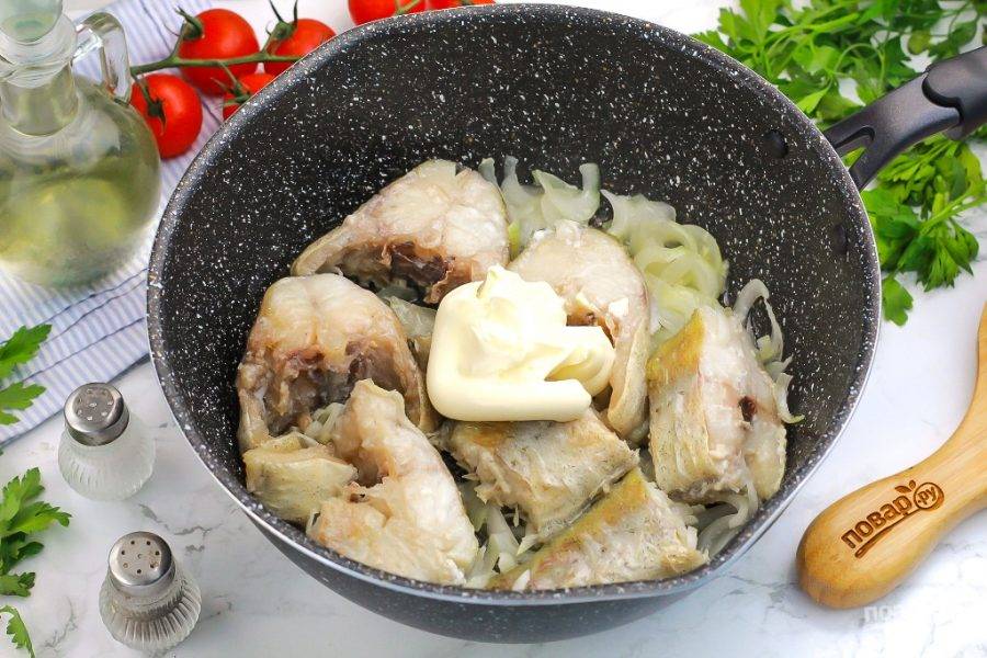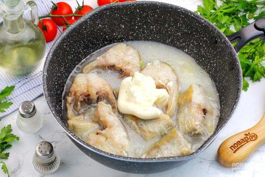 Доведите жидкость до кипения и убавьте нагрев до умеренного. Протомите минтая под крышкой в майонезе примерно 5-6 минут. Рыбу долго томить не нужно, так как она и так уже готова. Главное — придать ей нежный вкус. Майонез сам распределится по жидкости и у вас получится аппетитный соус. Если любите свежую зелень — самое время добавить ее измельченной: укроп, петрушку, кинзу и т.д.