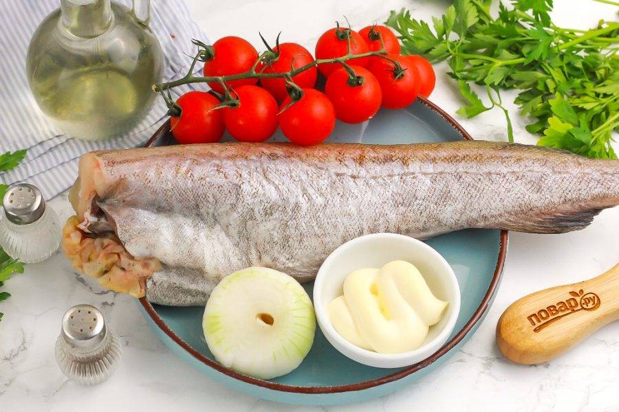 Подготовьте указанные продукты. Минтая разморозьте, если покупали рыбу замороженной. Тщательно очистите тушку от чешуи, внутренностей и промойте внутри и снаружи. С лука снимите шелуху и также промойте. По желанию можно добавить пару зубчиков чеснока, если вы не против его аромата в блюде.