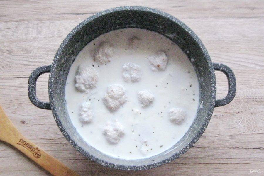 Налейте остальные сливки и перемешайте. Добавьте 150 мл. бульона, в котором варились митболы. Посолите и поперчите соус по вкусу.