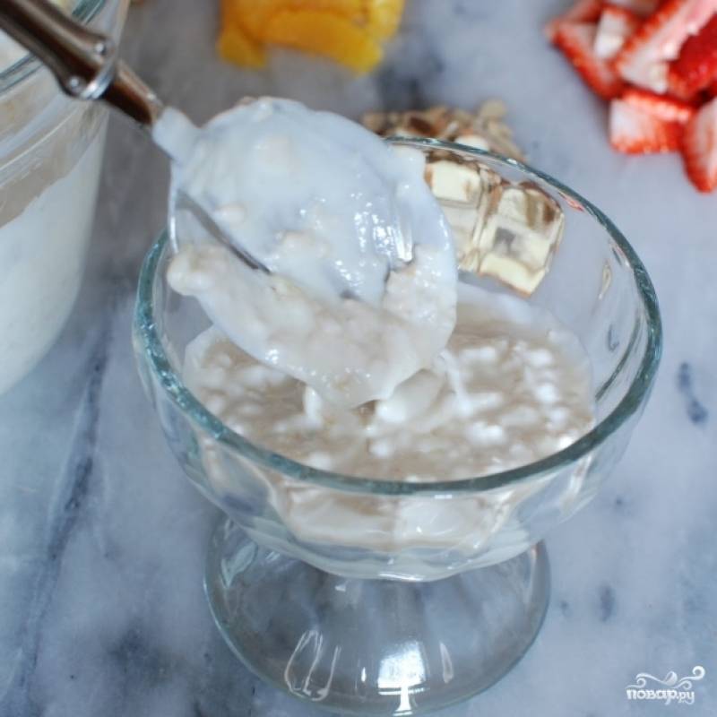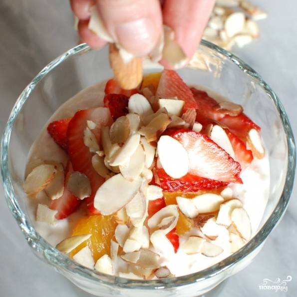 Добавляем нарезанные фрукты и орехи по вкусу - и подаем. Приятного аппетита! ;)