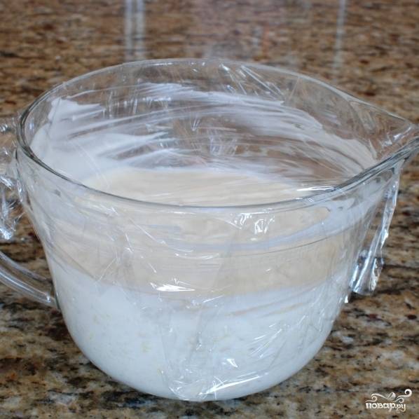 Накрываем пищевой пленкой и отправляем на ночь в холодильник.