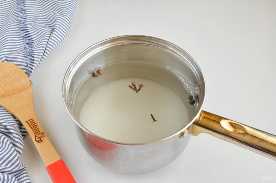 В воду выложите соль, сахар, гвоздику и душистый перец. Доведите до кипения, снимите с огня, влейте уксус. Заливка готова.
